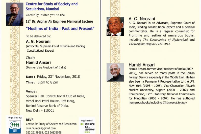 The 12th Dr. Asghar Ali Engineer Memorial lecture will be delivered by A.G. Noorani, Advocate, Supreme Court of India and leading Constitutional expert on “Muslims of India: Past and Present” on 23rd November 2018. The lecture will be moderated by Hamid Ansari, former Vice President of India.