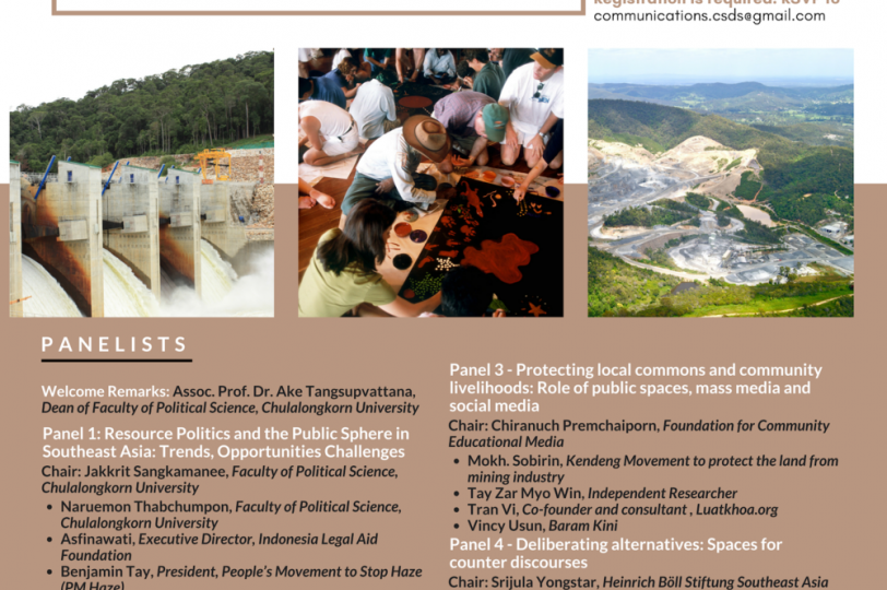 This public forum invites civil society, academics, journalists, lawyers, state officials and others to discuss the trends, opportunities and challenges of the public sphere for ensuring fair resource politics in Southeast Asia. Panelists will provide a range of case studies and analysis from across Southeast Asia in relation to resource politics and the public sphere, including: the role of civil society, government and corporations; an evaluation of the opportunities and challenges in local, national and transnational laws and policies; and the role of mass media and social media.
