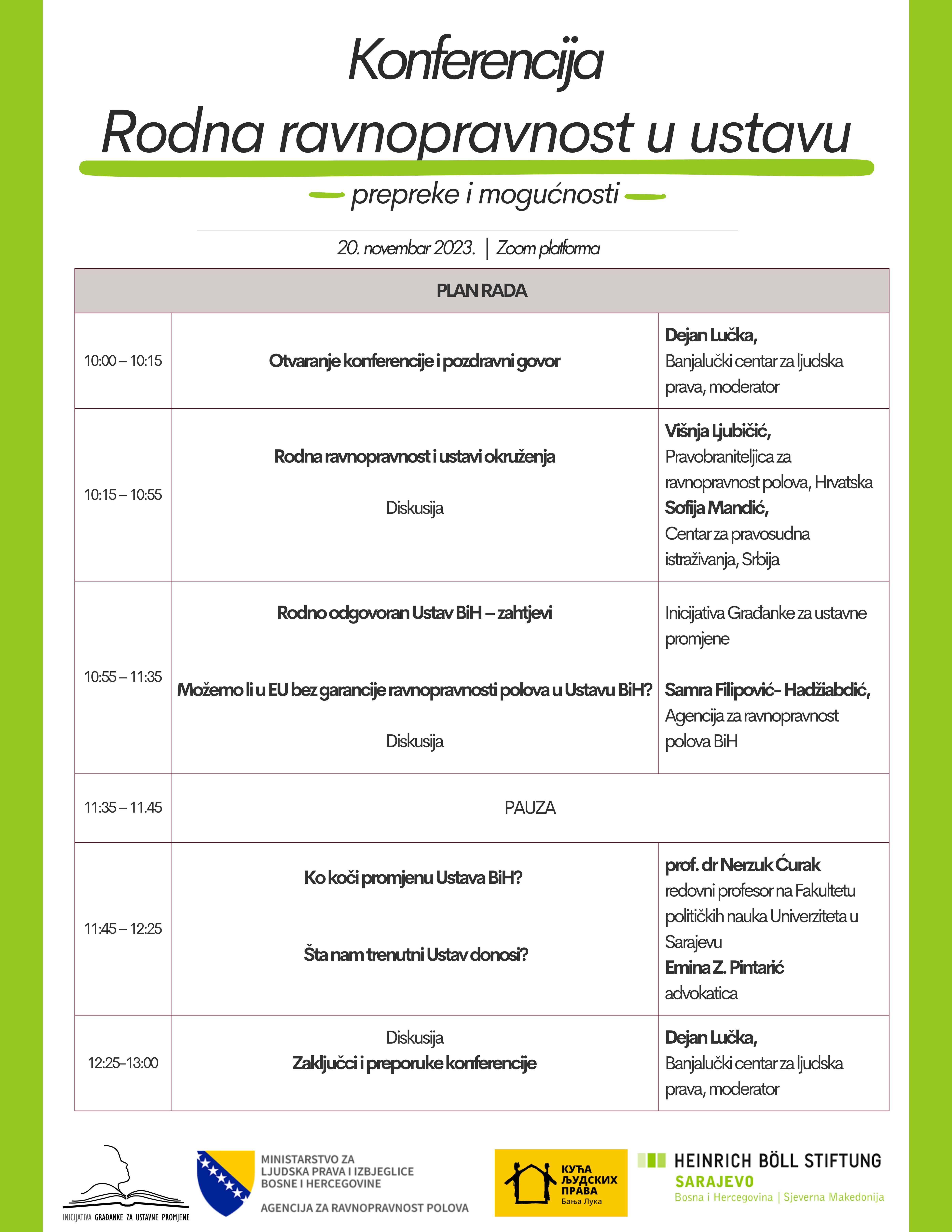 Inicijativa Građanke za ustavne promjene u saradnji sa Agencijom za ravnopravnost polova BiH, Kućom ljudskih prava Banja Luka i Fondacijom Heinrich Böll organizuje online konferenciju pod nazivom „Rodna ravnopravnost u ustavu – prepreke i mogućnosti” koja će se održati 20. novembra 2023. godine od 10 do 13 časova.