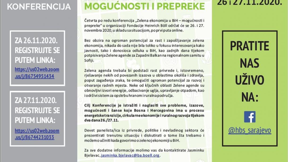 Četvrta po redu konferencija „Zelena ekonomija u BiH – mogućnosti i prepreke“ u organizaciji Fondacije Heinrich Böll održat će se 26. i 27. novembra 2020, u skladu sa situacijom, po prvi puta online.
