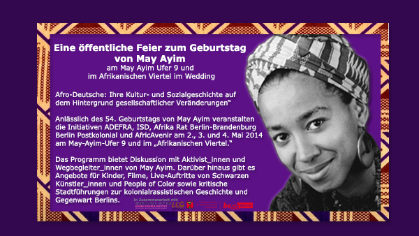 Anlässlich des 54. Geburtstags von May Ayim veranstalten die Initiativen ADEFRA, ISD, Afrika Rat Berlin-Brandenburg, Berlin Postkolonial und AfricAvenir am 2. und 3. Mai 2014 im "Spreeraum" des FHXB Museums und am 4. Mai im "Afrikanischen Viertel" eine familienfreundliche Feier unter dem Titel, den Ayim für ihre Diplomarbeit wählte. "Afro-Deutsche: Ihre Kultur- und Sozialgeschichte auf dem Hintergrund gesellschaftlicher Veränderungen"