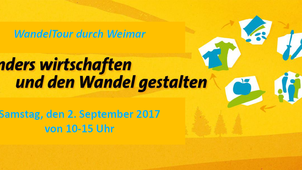 Wir begeben uns in Weimar auf die Suche nach Orten des Wandels, wo das Wirtschaften, das Miteinander und der Umgang mit der Umwelt neu gedacht werden. Es sind Initiativen, Projekte und Organisationen, in denen Veränderung angestrebt, Alternativen gelebt und Zeichen gesetzt werden. Wir kommen ins Gespräch mit den verschiedenen Akteuren des Wandels, die ihre Erfahrungen und Visionen mit uns teilen. Am Ende werden wir uns darüber austauschen, wie wir in unserem Lebens- und Arbeitsumfeld den gesellschaftlichen und wirtschaftlichen Wandel mitgestalten können.