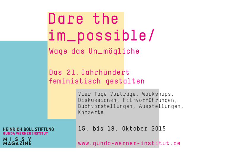 Feminismus ist aktueller denn je. Trotzdem kommen mediale Debatten von Krise bis Pegida meist ohne feministische Perspektiven und Kritik aus. Kein Wunder, dass weite Teile der Öffentlichkeit meinen, feministische Ideen erschöpften sich in Twitter-Hashtags wie #Aufschrei und Quotenforderungen. Dabei ist Feminismus viel mehr: Feminismus bedeutet Kritik am gesellschaftlichen System und an Ungerechtigkeit, Diskriminierung und Ausgrenzung. Er zeigt gesellschaftliche Alternativen auf und formuliert politische Forderungen. Vier Tage lang stehen das Gunda-Werner-Institut und die Heinrich-Böll-Stiftung im Zeichen von Feminismen. „Dare the im_possible / Wage das Un_mögliche“ heißt das Event in Kooperation mit dem Missy Magazine. Es wird aktuelle Themen feministisch unter die Lupe nehmen, zum Streit herausfordern, Raum geben für verschiedene Positionen, nach innen und außen schauen, Utopien benennen und kritisieren. „Dare the im_possible" ist Konferenz und Labor; ein Ort zum Kennenlernen und Vernetzen.