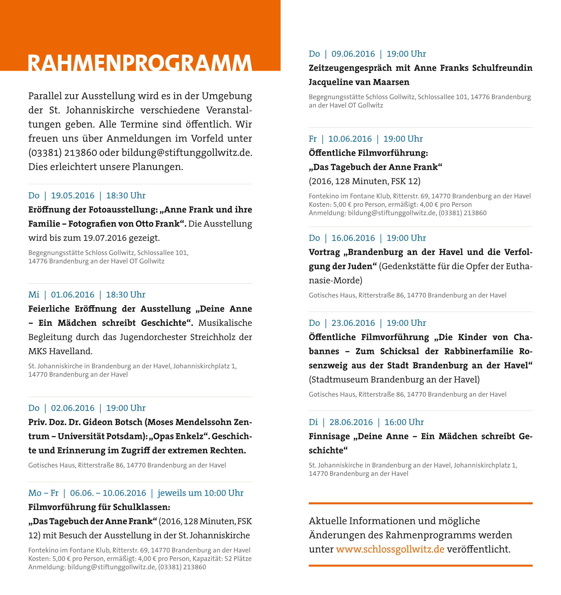 Von 01.06. bis 28.06.2016 wird die Wanderausstellung »Deine Anne. Ein Mädchen schreibt Geschichte« in der St. Johanniskirche in Brandenburg an der Havel präsentiert. Das Tagebuch des jüdischen Mädchens Anne Frank (1929-1945) ist Symbol für den Völkermord an den Juden und Jüdinnen durch die Nationalsozialisten und intimes Dokument der Lebens- und Gedankenwelt einer jungen Schriftstellerin.