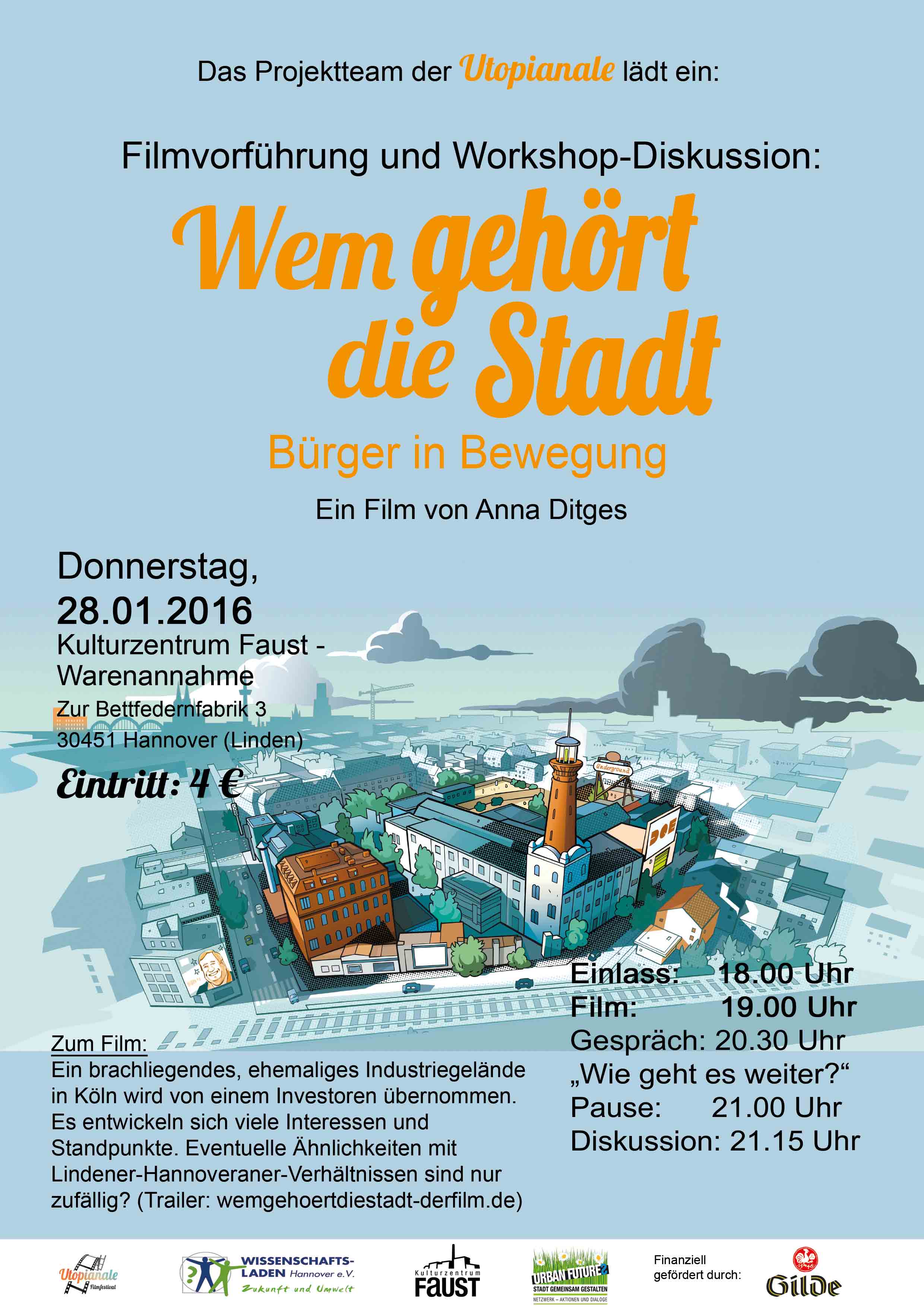 Das Projektteam der Utopianale lädt ein zum Film: Wem gehört die Stadt - Ein brachliegendes, ehemaliges Industriegelände in Köln wird von einem Investoren übernommen. Es entwickeln sich viele Interessen und Standpunkte. Eventuelle Ähnlichkeiten mit Lindener-Hannoveraner-Verhältnissen sind nur zufällig? (Trailer: wemgehoertdiestadt-derfilm.de)