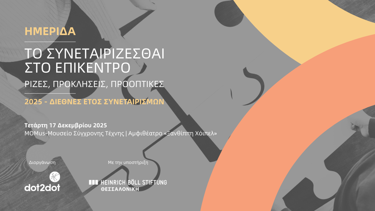 Η Dot2Dot Κοιν.Σ.Επ., με την υποστήριξη του Ιδρύματος Χάινριχ Μπελ – Γραφείο Θεσσαλονίκης, διοργανώνει ημερίδα με αφορμή την ανακήρυξη του 2025 ως Διεθνές Έτος Συνεταιρισμών από τον ΟΗΕ και φέρνει το συνεταιρίζεσθαι στο επίκεντρο.