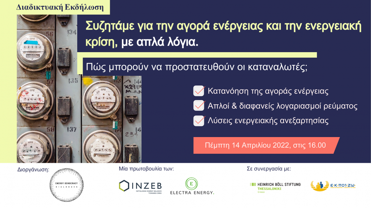Μέσα σ’ αυτό το πλαίσιο, μια ιδιαίτερα χρήσιμη και κατατοπιστική εκδήλωση διοργανώνουν το INZEB και η Electra Energy σε συνεργασία με το Ίδρυμα Χάινριχ Μπελ Γραφείο Θεσσαλονίκης - Ελλάδα και την Ένωση Καταναλωτών - Η Ποιότητα Της Ζωής (Ε.Κ.ΠΟΙ.ΖΩ.), στο πλαίσιο της πρωτοβουλίας Energy Democracy Dialogues.