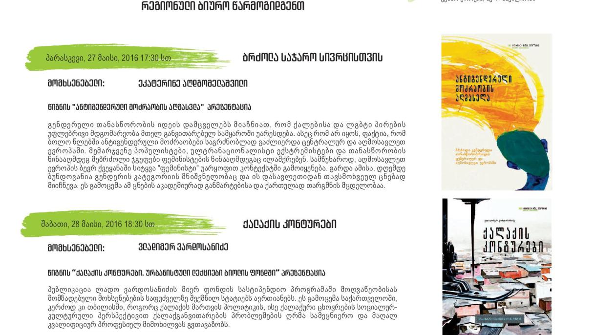 On May 27, at 5:30 pm, in the frameworks of the Tbilisis Internation Book Fair the South Caucasus Regional Office of the Heinrich Boell Foundation organises presentation of collection of articles "Anti-Gender Movement on the Rise?".