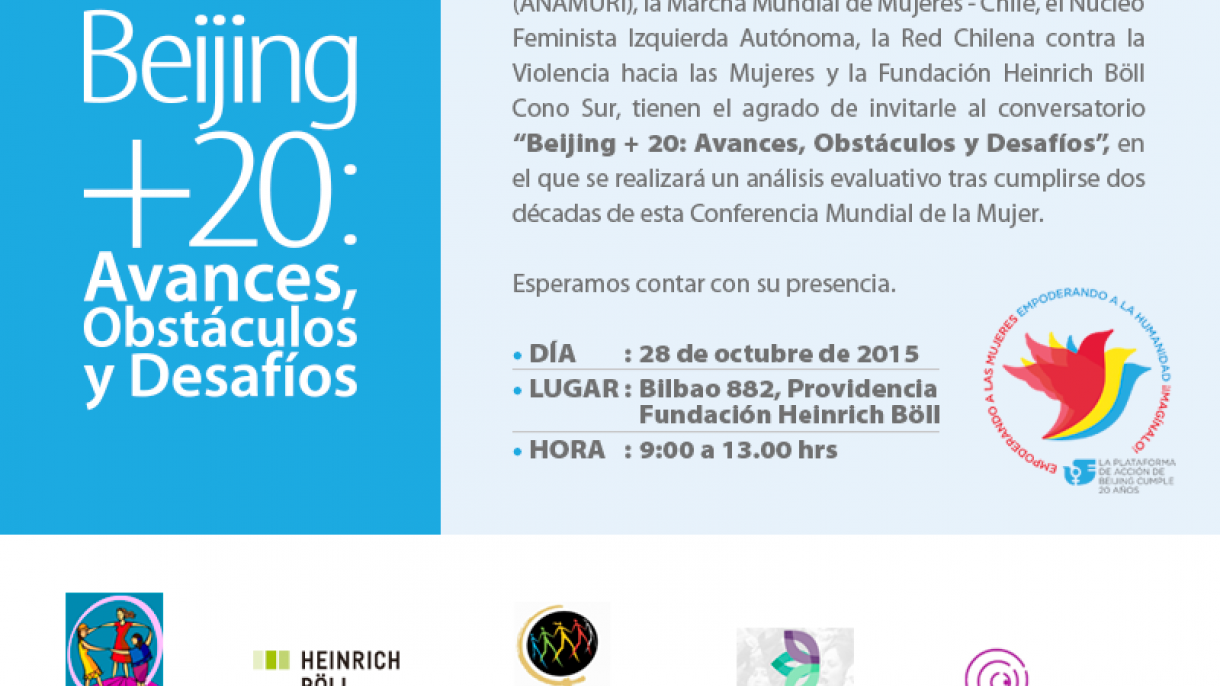 La Fundación Heinrich Böll para Cono Sur en conjunto con la Asociación Nacional de Mujeres Indígenas y Rurales (ANAMURI), la Marcha Mundial de Mujeres-Chile, el Núcleo Feminista Izquierda Autónoma y la Red Chilena contra la Violencia hacia las Mujeres realizarán este 28 de octubre el conversatorio “Beijing +20: Avances, Obstáculos y Desafíos”, donde harán un análisis evaluativo de la Cuarta Conferencia Internacional de la Mujer, tras cumplirse dos décadas desde su realización.
