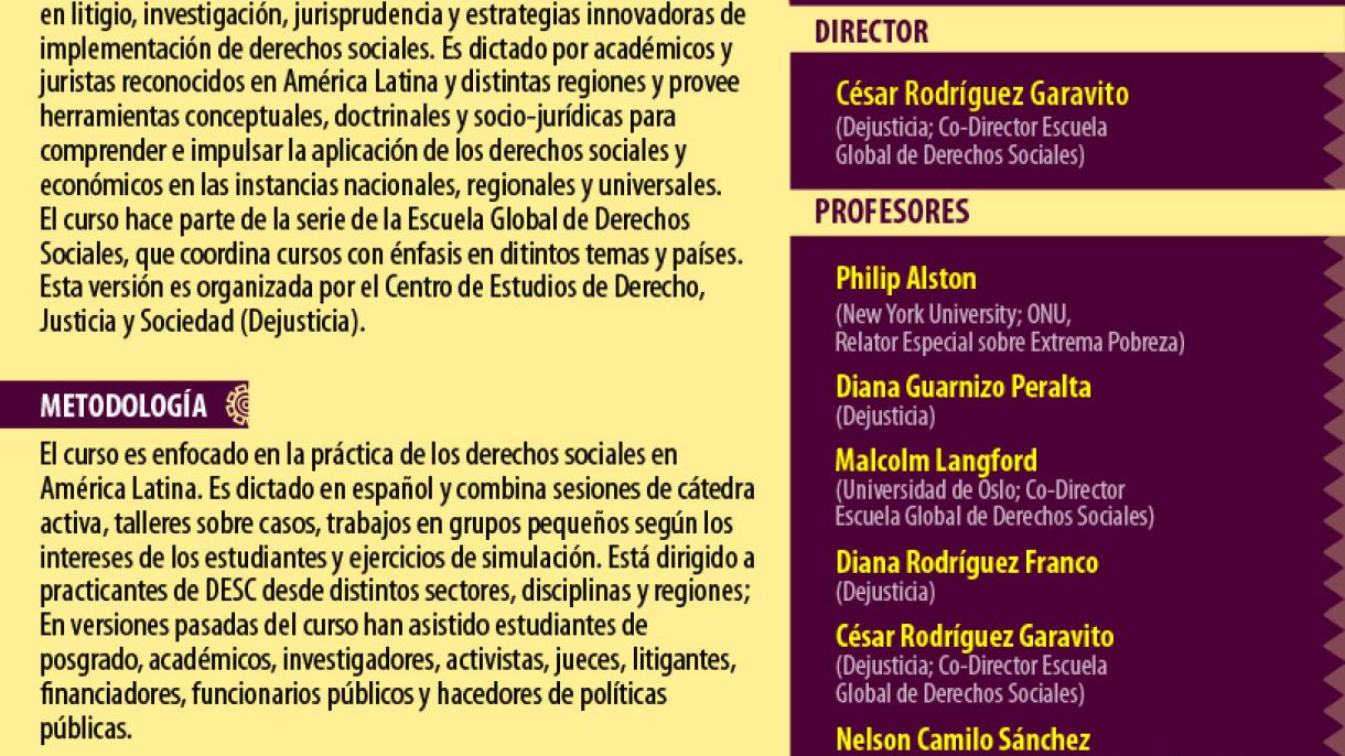 Este curso será dictado por académicos y juristas reconocidos en América Latina y otras regiones como Philip Alston (Relator de las Naciones Unidas sobre Extrema Pobreza), Rodrigo Uprimny (Miembro del Comité DESC), Margaret L. Satterthwaite (Directora del Instituto Robert L. Bernstein para los Derechos Humanos), Malcolm Langford (Profesor Universidad de Oslo) y César Rodríguez-Garavito (Director Dejusticia), además de otros profesores colombianos miembros de Dejusticia como Diana Rodríguez (Directora Medio Ambiente), Camilo Sánchez (Director Justicia Transicional) y Diana Guarnizo (Directora Derechos Sociales).