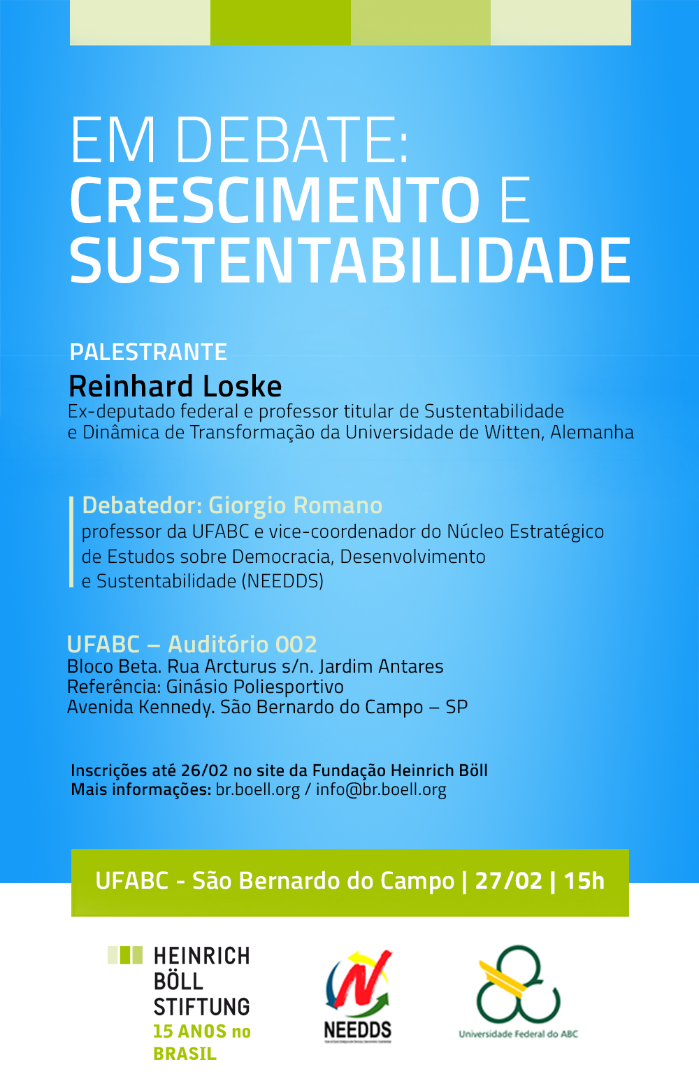 A Fundação Heinrich Böll, em parceria com o Núcleo de estudos estratégicos - democracia, desenvolvimento e sustentabilidade (NEEDDS) e a Universidade Federal do ABC (UFABC), promoverá um debate sobre as contradições e desafios do crescimento, decrescimento, futuro da economia e bem estar social. Estarão presentes Reinhard Loske, ex-deputado federal e professor titular de Sustentabilidade e Dinâmica de Transformação da Universidade de Witten, Alemanha e Giorgio Romano, professor da UFABC e vice-coordenador do NEEDDS. O evento acontece no dia 27 de fevereiro, às 15h, na UFABC, São Bernardo do Campo (SP).