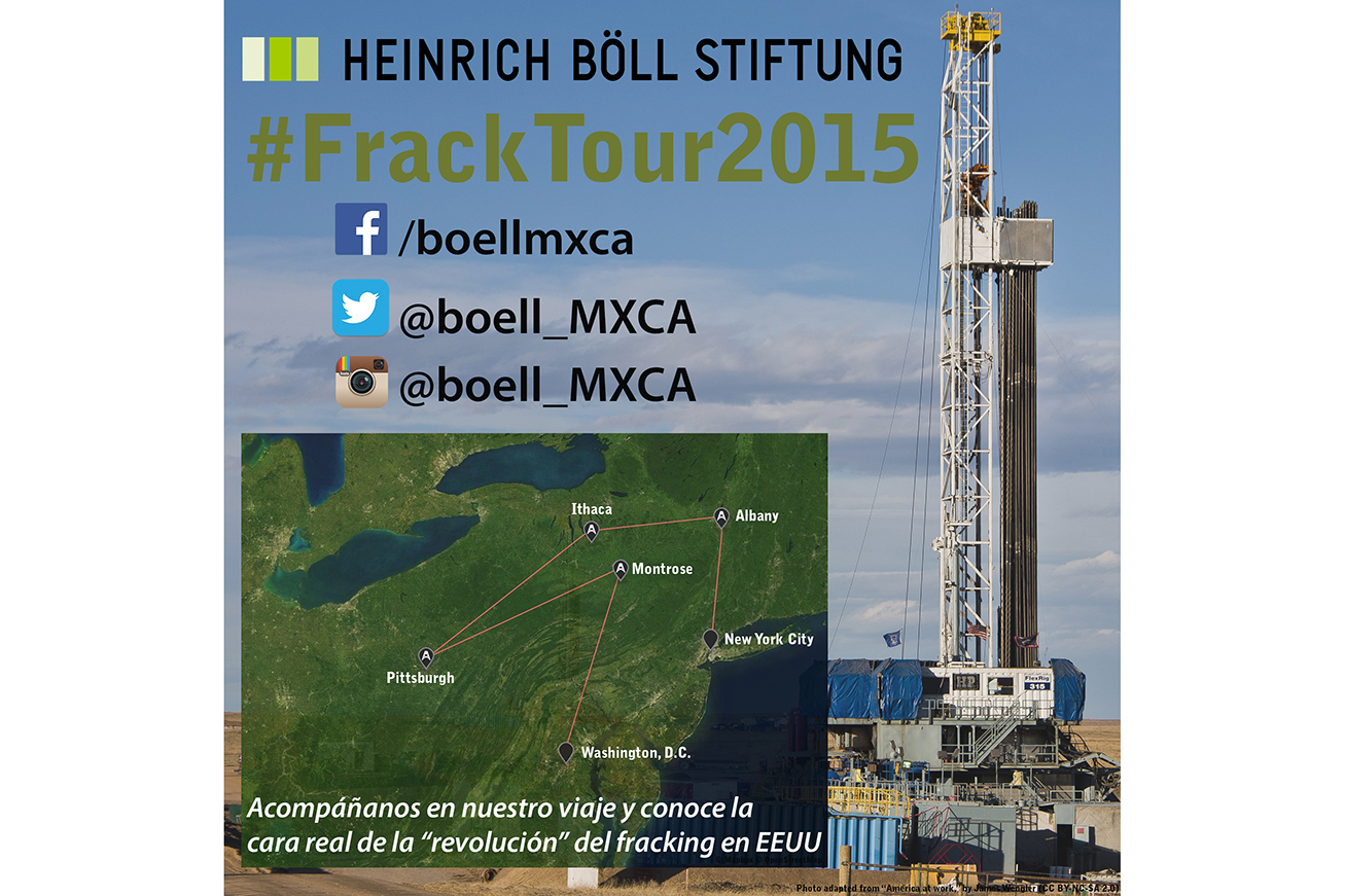 Del 7 al 11 de Septiembre se realizará el Tour de Fracking por Estados Unidos en el cual un grupo de colegas de la Fundación Heinrich Böll así como periodistas, investigadores, diputados y abogados de varios países del mundo conocerán tres regiones de EEUU donde se practica el fracking, conocerán los impactos de la industria del gas natural en las economías locales, la infraestructura local y en el medio ambiente. Las y los participantes asistirán a varias reuniones con funcionarios públicos, representantes de empresas y organizaciones de la sociedad civil para conocer los debates en torno al fracking en EEUU y llevarlos a sus países.