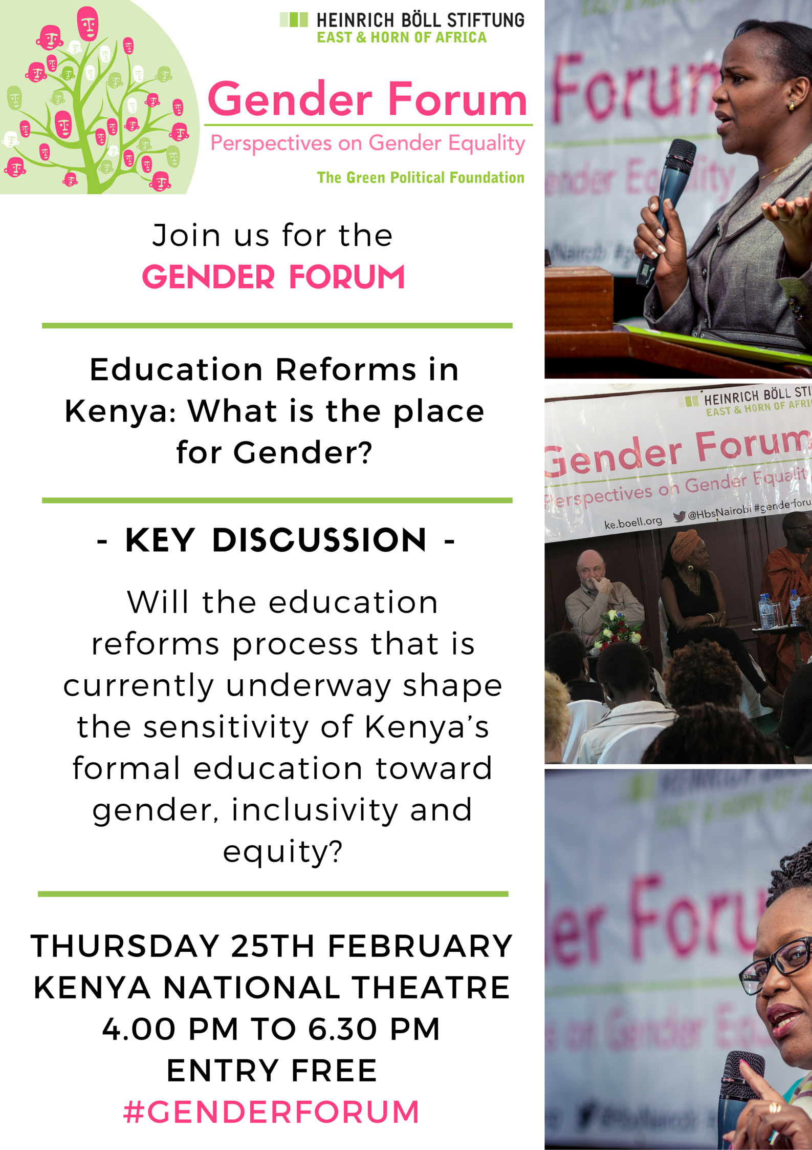 The Gender Forum is a monthly public dialogue convened by the Heinrich Böll Stiftung since 2001, encouraging dialogue on pertinent national issues with a gendered lens. It brings together scholars, law makers and implementers, civil activists, government institutions, students and the general public, aiming at sharing knowledge and inspiring gendered analysis of policy and programmes. The forum also convenes around the country in response to county needs.