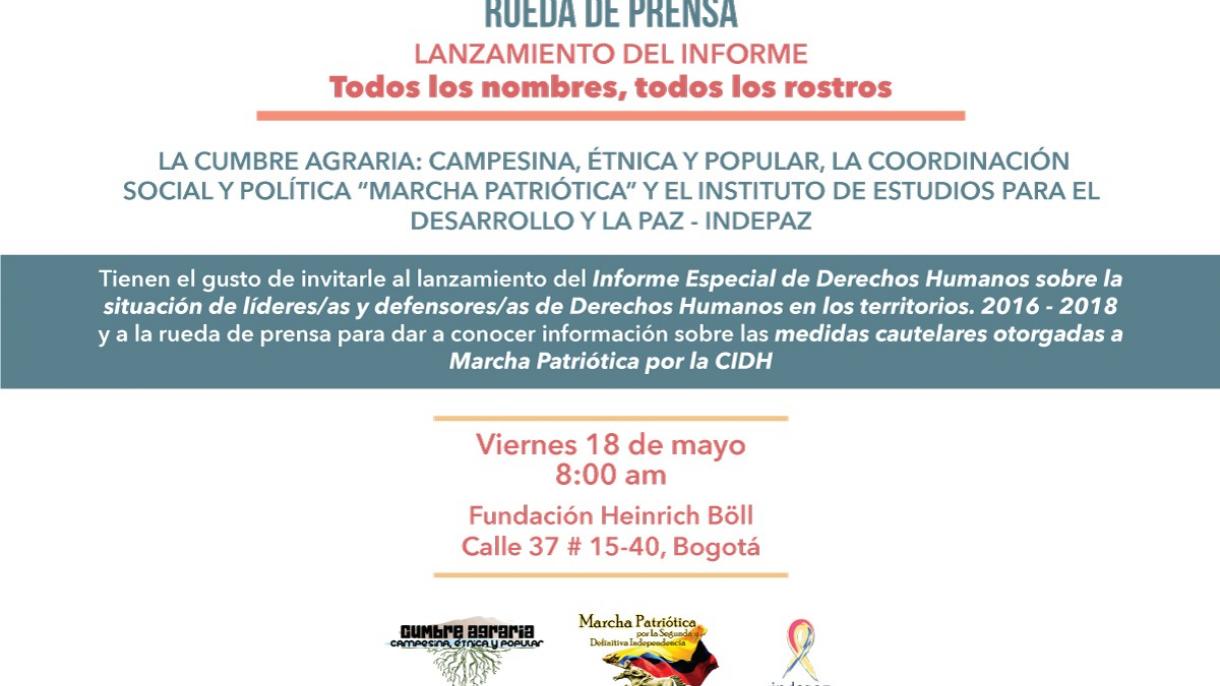 Tienen el gusto de invitarle al lanzamiento del Informe especial de derechos humanos sobre la situación de líderesas y defensores/as de derechos humanos en los territorios. 2016-2018 y a la rueda de prensa para dar a conocer información sobre las medidas cautelares otorgadas a Marcha Patriótica por la CIDH (Comisión Interamericana de Derechos Humanos).