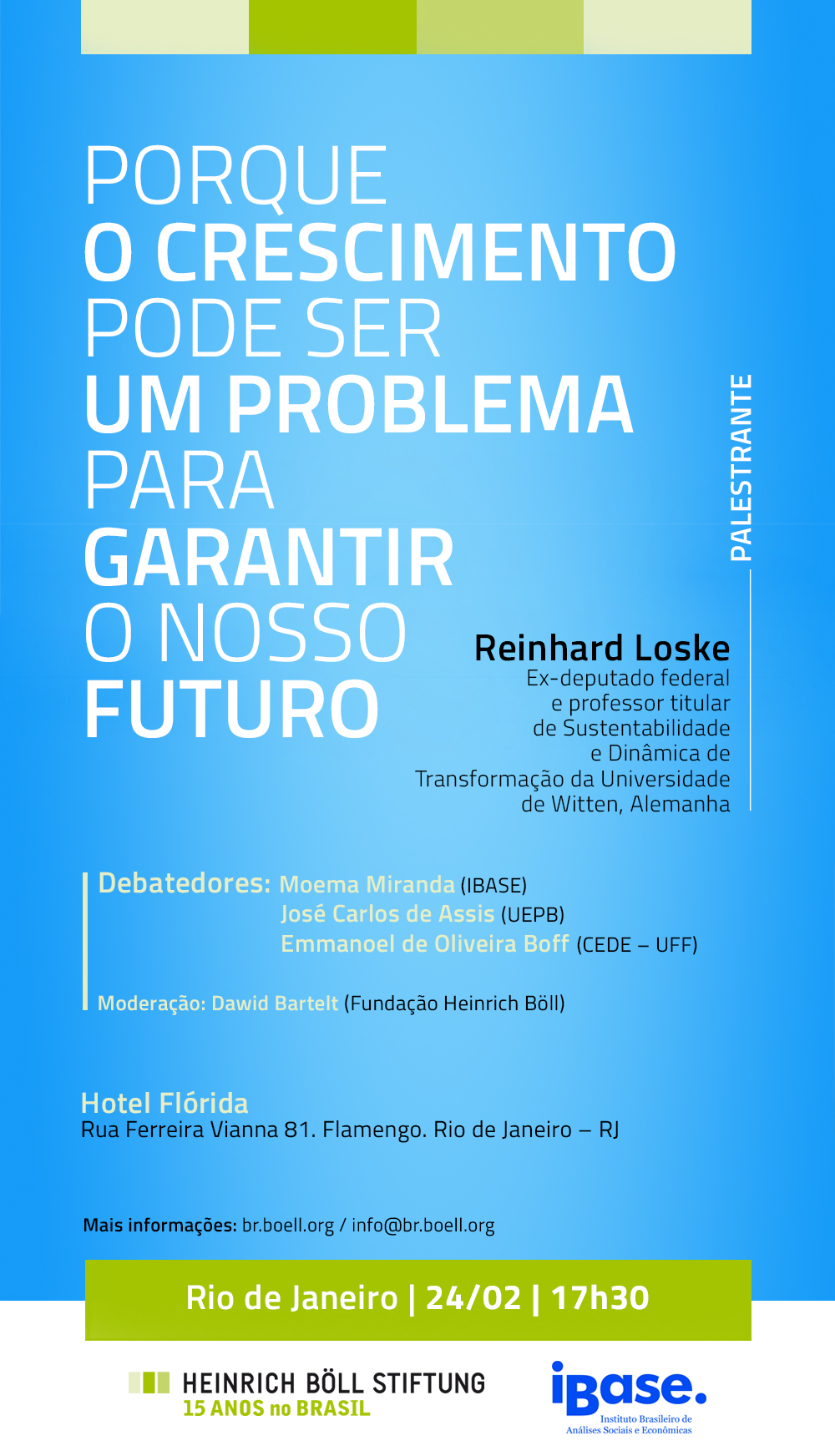 A Fundação Heinrich Böll e o Ibase promoverão um debate sobre as contradições e desafios do crescimento, decrescimento, futuro da economia e bem estar social com a presença de Reinhard Loske, ex-deputado federal e professor titular de Sustentabilidade e Dinâmica de Transformação da Universidade de Witten, Alemanha; Moema Miranda, diretora do IBASE, José Carlos de Assis, economista e professor da Universidade Estadual da Paraíba e Emmanoel de Oliveira Boff, professor da da faculdade de economia da Universidade Federal Fluminense. O evento acontece no dia 24 de fevereiro, às 17h30, no hotel Flórida, Rio de Janeiro.
