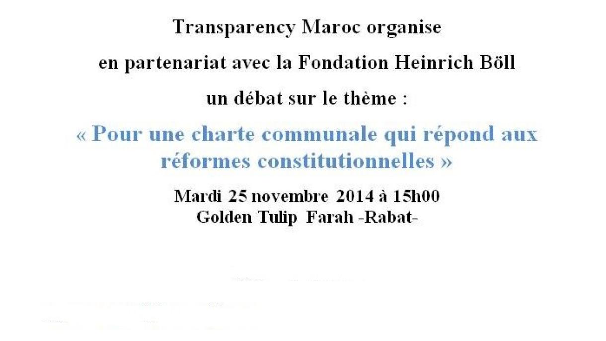 Transparency Maroc a l’honneur de vous inviter au débat qu’elle organise, en partenariat avec la Fondation Heinrich Böll, le Mardi 25novembre 2014 à 15h au Golden Tulip Farah Rabat, sur le thème : “Pour une charte communale qui répond aux réformes constitutionnelles.”