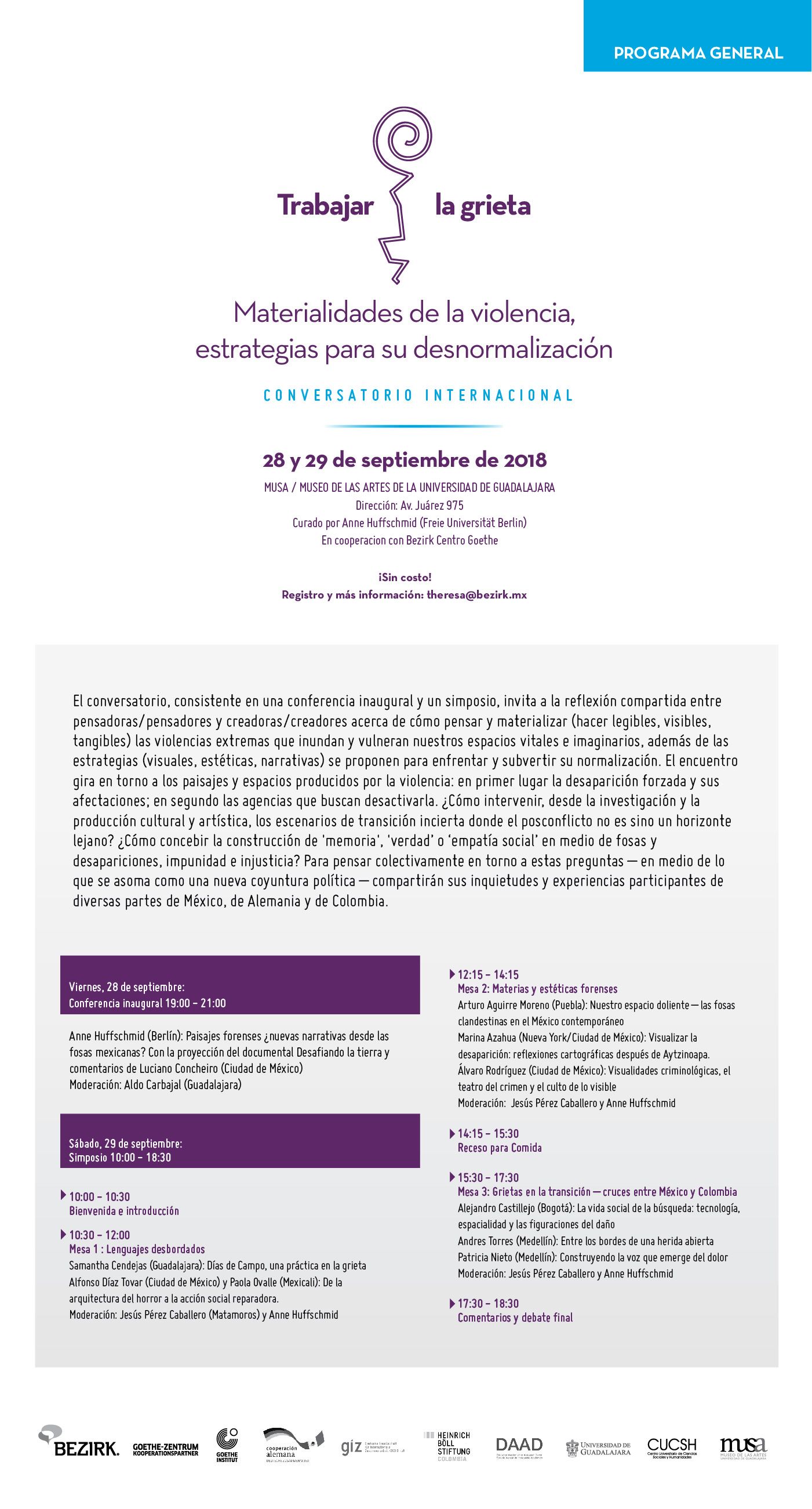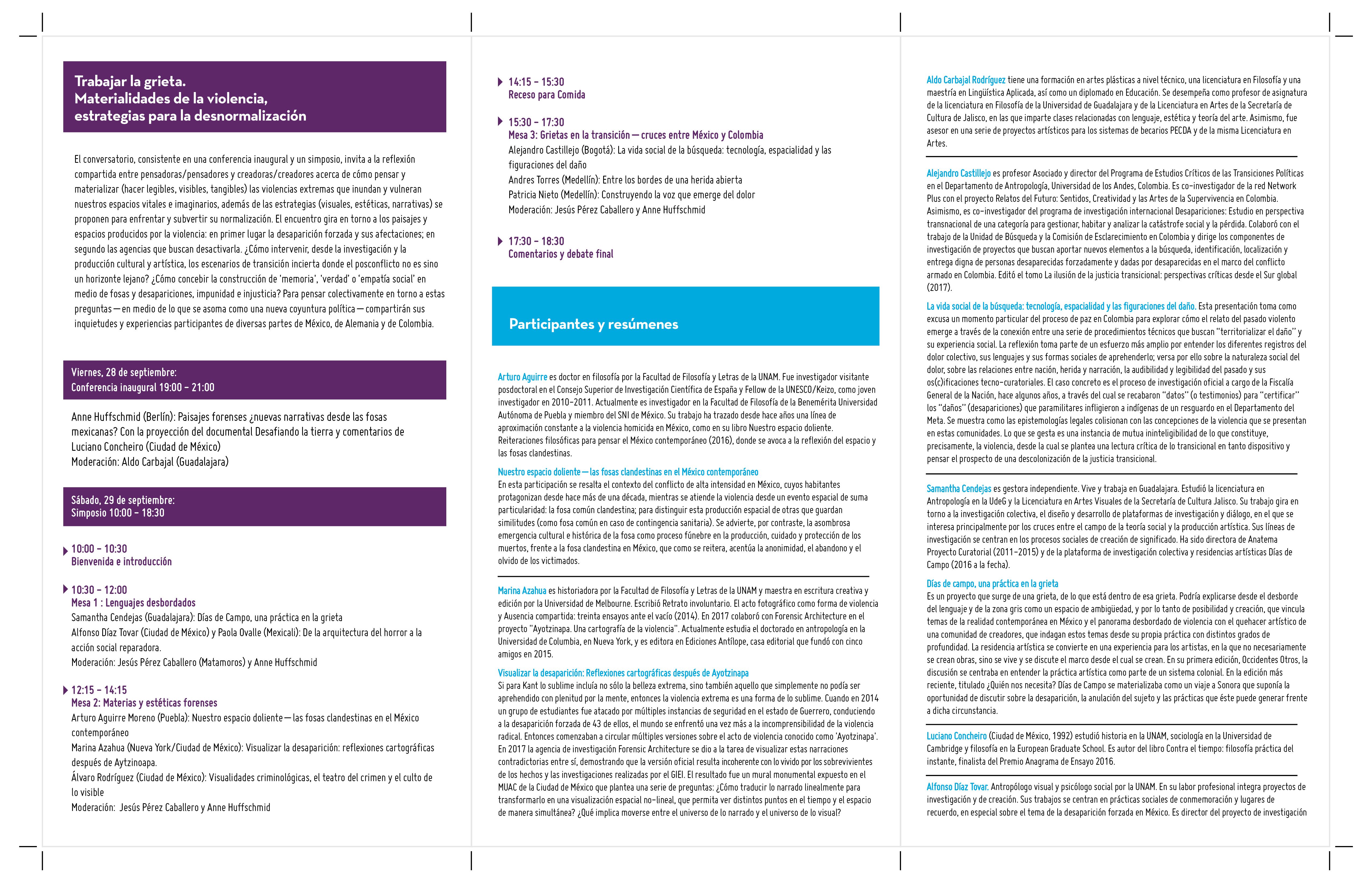 El encuentro gira en torno a los paisajes y espacios producidos por la violencia: en primer lugar, la desaparición forzada y sus afectaciones; en segundo las agencias que buscan desactivarla. ¿Cómo intervenir, desde la investigación y la producción cultural artística, el escenario de transición incierta desde el posconflicto no es sino un horizonte lejano? ¿cómo concebir la construcción de ¨memoria¨, ¨verdad¨, o ¨empatía social¨ en medio de fosas y desapariciones, impunidad e injusticia? Para pensar colectivamente en torno a estas preguntas - en medio de lo que se asoma como una nueva coyuntura política - compartirán sus inquietudes y experiencias participantes de diversas partes de México, Alemania y Colombia.