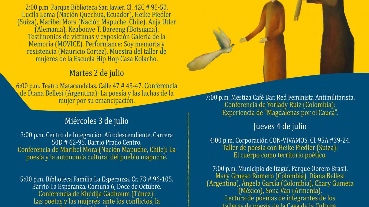 7:00 p.m. Municipio de Itagüí. Parque Obrero Brasil. Calle 48 con Carrera 50. Mary Grueso Romero (Colombia), Diana Bellesi (Argentina), Ángela García (Colombia), Chary Gumeta (México), Sona Van (Armenia). El cuerpo como territorio. Lectura de poemas de integrantes de los talleres de poesía de la Casa de la Cultura.