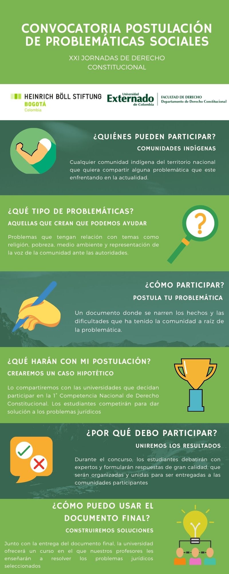 La presente convocatoria tiene como objetivo recopilar distintas problemáticas que estén enfrentando las comunidades indígenas, para que estas sean estudiadas y resueltas por la/os estudiantes que participen en la primera Competencia Nacional de Derecho Constitucional, organizada en el marco de las XXI Jornadas de Derecho Constitucional por el Departamento de Derecho Constitucional de la Universidad Externado de Colombia. Se seleccionarán aquellas problemáticas que más se relacionen con las temáticas de nuestras Jornadas de este año.