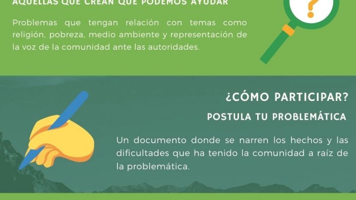 A cualquier comunidad indígena del territorio nacional que quiera compartir alguna problemática que esté enfrentando actualmente. Las problemáticas, por ejemplo, pueden consistir en necesidades de la comunidad con relación al ejercicio de la consulta previa, el uso de la tierra y los recursos naturales, la falta de acceso a agua potable u otras condiciones mínimas de vida, el respeto a su propia cosmovisión indígena, entre otros.
