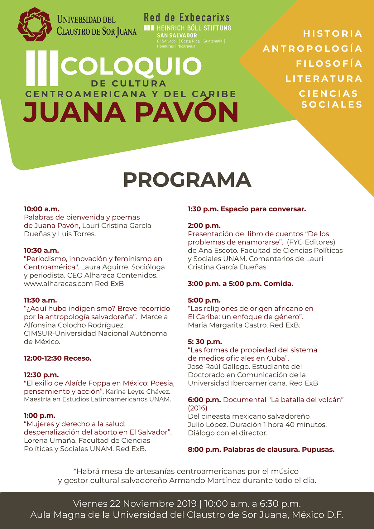 La Universidad del Claustro de Sor Juana y la Red de Exbecarixs Heinrich Böll Stiftung San Salvador, invitan al III Coloquio de Cultura Centroamericana y del Caribe Juana Pavón.