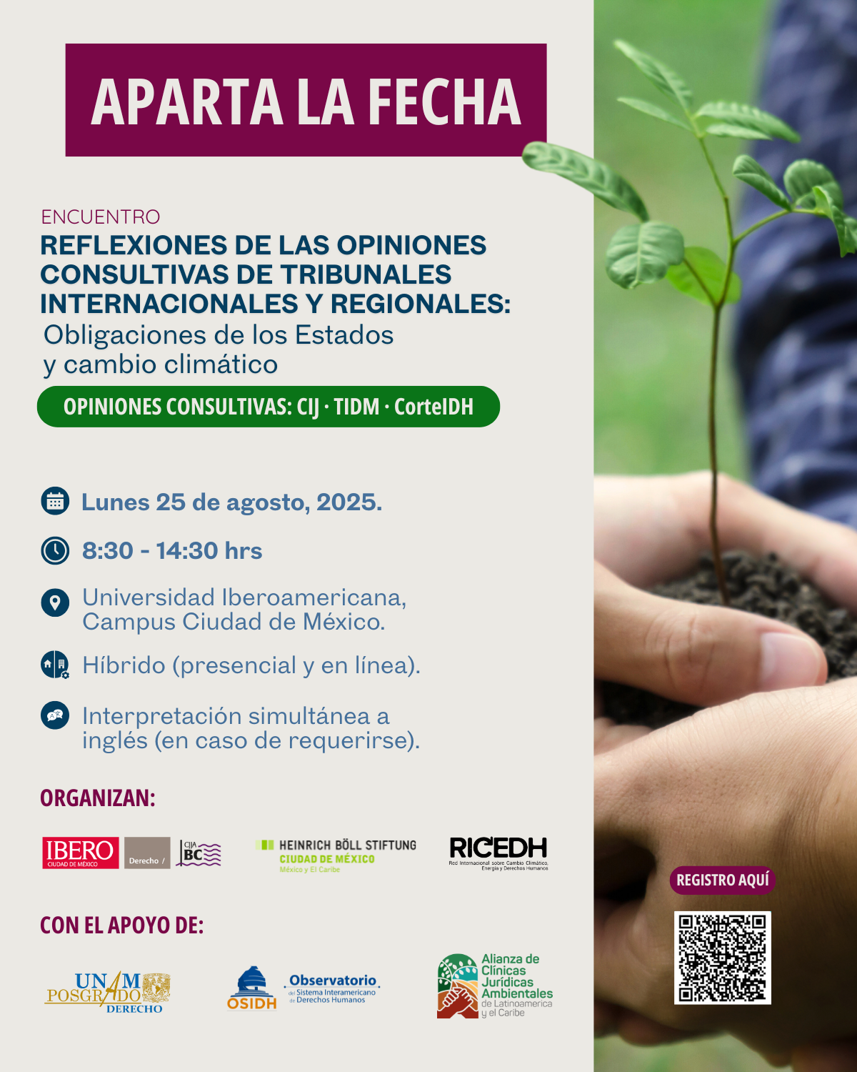 Tipo de evento: este será el primero de una serie de eventos para conversar sobre el impacto de las opiniones consultivas en materia climática que se realizarán en colaboración entre el Laboratorio por la Justicia Ambiental y Climática de la Ibero (LabJAC), el Observatorio del Sistema Interamericano de Derechos Humanos de la UNAM, la Fundación Heinrich Böll México y la Red Internacional sobre Cambio Climático, Energía y Derechos Humanos (RICEDH).
