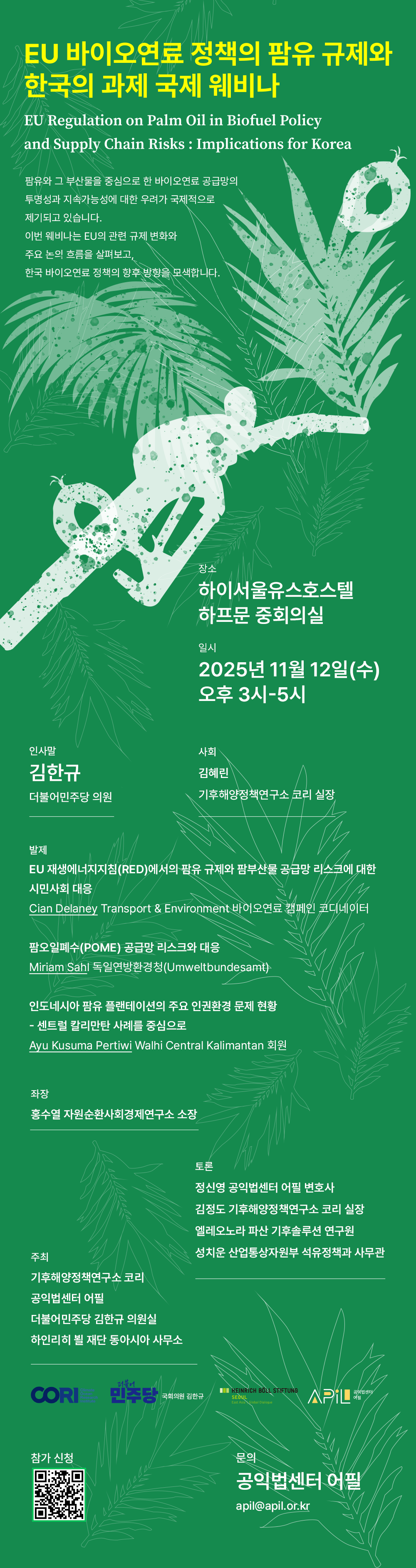 - 주최: 기후해양정책연구소코리, 공익법센터 어필, 더불어민주당 김한규 의원실, 하인리히뵐재단동아시아사무소
