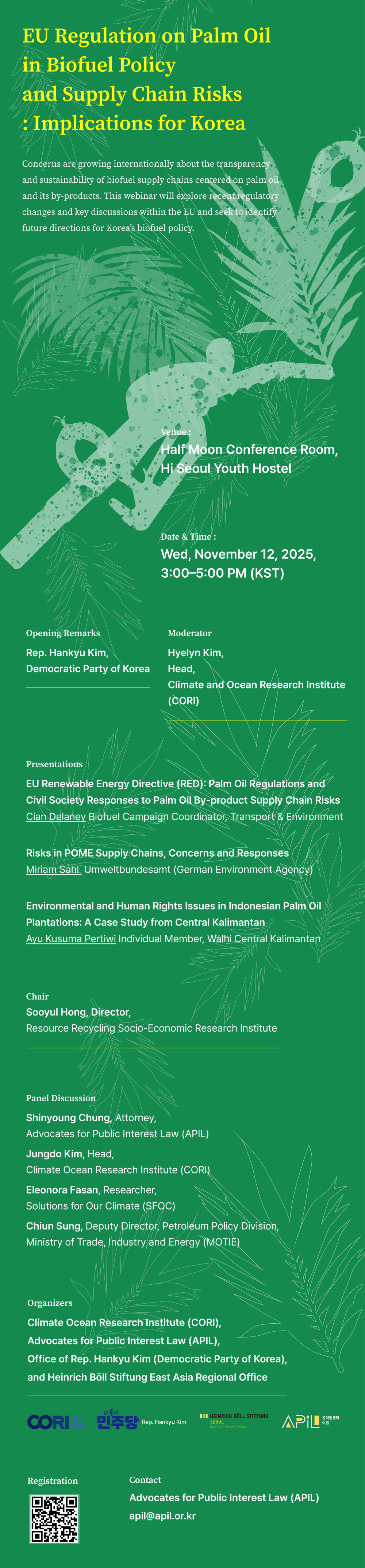 - Organizers: Climate Ocean Research Institute (CORI), Advocates for Public Interest Law (APIL), Office of Rep. Hankyu Kim (Democratic Party of Korea), and Heinrich Böll Stiftung East Asia Regional Office