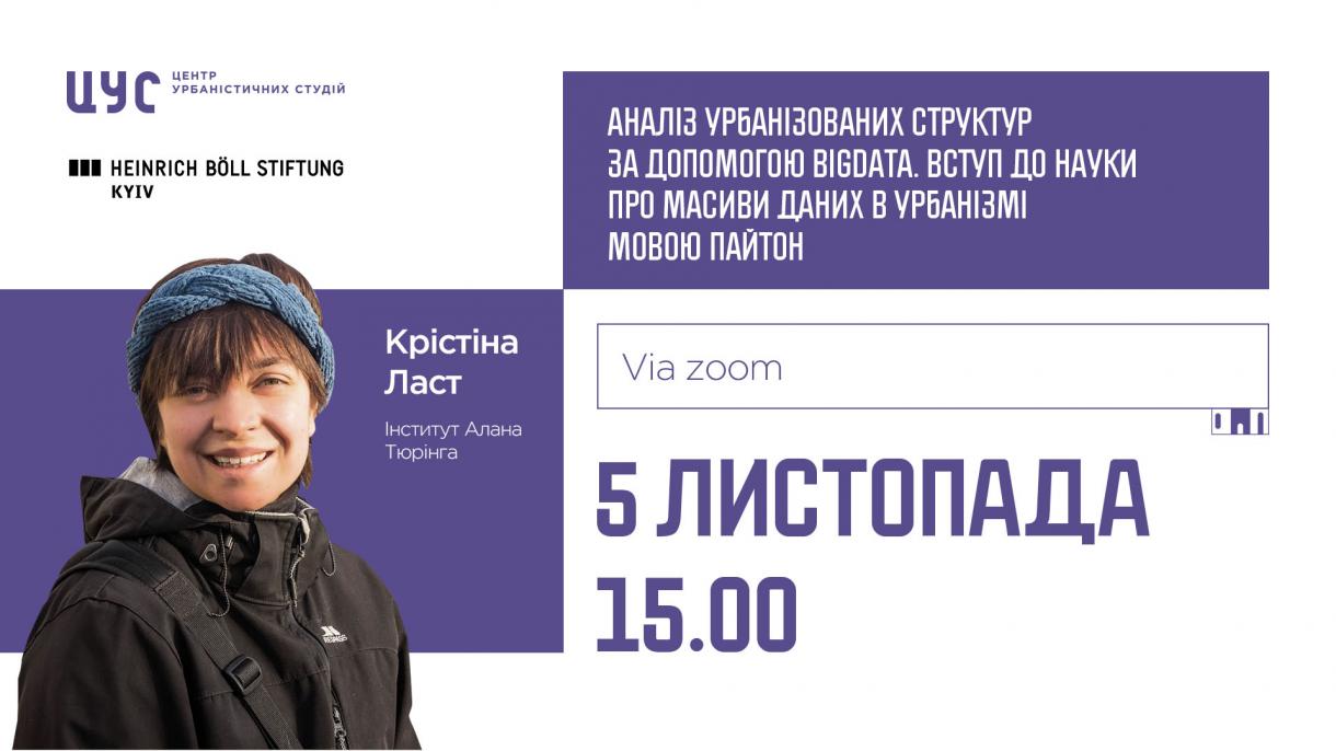 Під час лекції дослідниця Інституту Тюрінга (Велика Британія) Крістіна Ласт поділиться знаннями, як big data допомагає у вивченні міст. Вона продемонструє робочі процеси з OSMnx та даними з OpenStreetMap для вивчення моделей вуличної мережі, орієнтації та конфігурації в різних містах по всій Україні.
