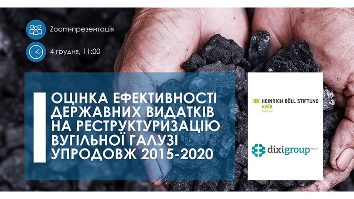 4 грудня об 11:00 Фонд ім. Г. Бьолля, Бюро Київ — Україна разом з аналітичним центром DiXi Group презентує результати дослідження «Оцінка ефективності державних видатків на реструктуризацію вугільної галузі (2015-2020)».