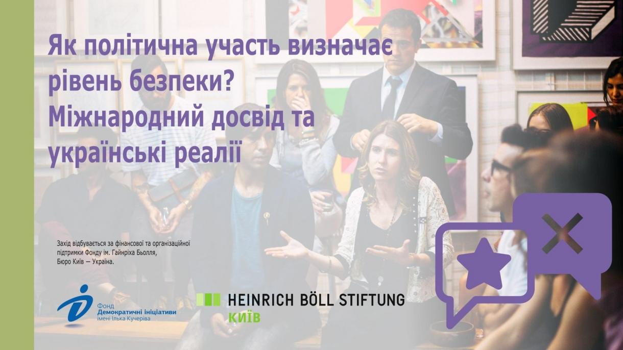 У демократичному суспільстві рівень активності громадян у політичних процесах значним чином залежить від відчуття власної безпеки – чи то участь у волевиявленні під час виборів, чи то у мирному протесті. Натомість від політичної участі громадян безпосередньо залежить якість урядування. Яка модель залучення є оптимальною та які проблеми стоять на шляху мобілізації населення? Фонд «Демократичні ініціативи» імені Ілька Кучеріва та Фонд імені Гайнріха Бьолля, Бюро Київ — Україна організовують онлайн-дискусію про взаємозв’язок політичної участі та безпеки.